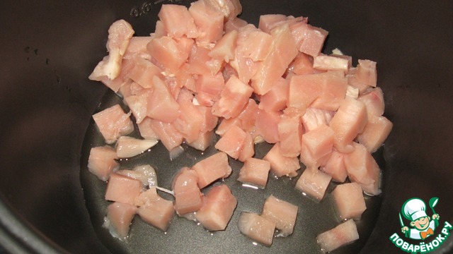 В чашу мультиварки (у меня объёмом она 5 литров) наливаем растительное масло и выкладываем филе. Обжариваем на программе Выпечка или жарка минут 10-15 (крышку я не закрывала, не забываем помешивать)