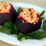 Наполнить свеклу. На дно формы налить молока или сливок и поставить запекаться.