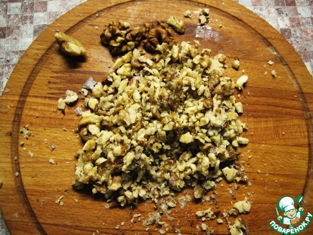 Орехи растолочь до мелких кусочков.