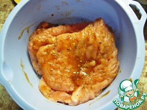 Грудку замариновать в любимых специях. У меня домашняя аджика.