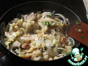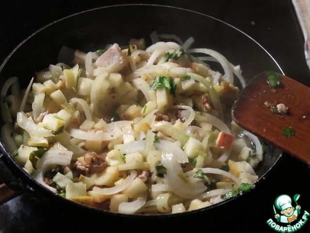 Орехи, яблоко, лук спасеровать в капельке масла.