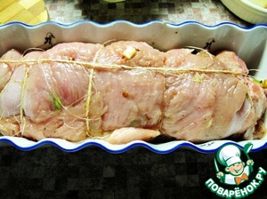Свернуть в рулет, перевязать бечевкой. Уложить в форму для запекания, в которую налито немного воды.