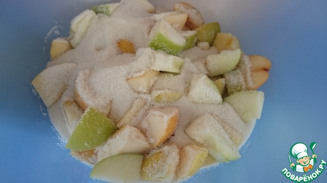 Пересыпать нарезанные фрукты в отдельную посуду, засыпать сахаром и дать немного постоять.