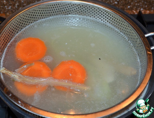 Залить 1 л. воды, добавить 1/2 моркови, репчатый лук и коренья.