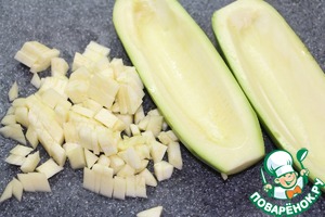 Молодой кабачок вымыть, отрезать "попки", разрезать пополам, вырезать сердцевину и нарезать её кубиками.