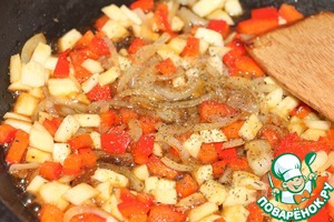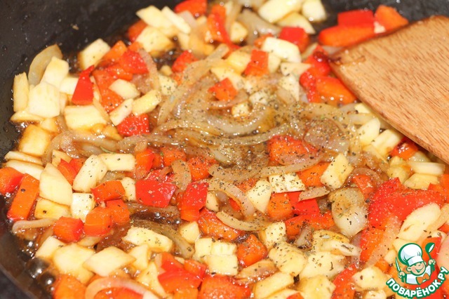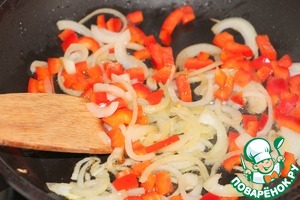 Лук почистить и нарезать полукольцами. Болгарский перец нарезать кубиками. Разогреть на сковороде растительное масло, обжарить овощи 2 минуты на сильном огне.