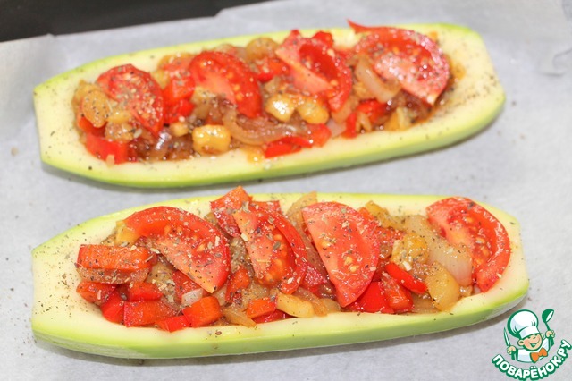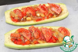Противень застелить пергаментом, выложить кабачковые лодочки, слегка присолить их изнутри, выложить начинку. Сверху распределить нарезанные четвертинками помидоры черри. Запекать в заранее разогретой до 180 градусов духовке 20-30 минут, или до мягкости кабачка.