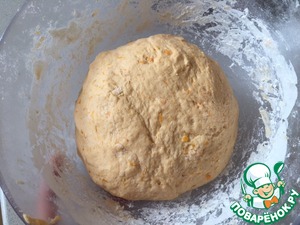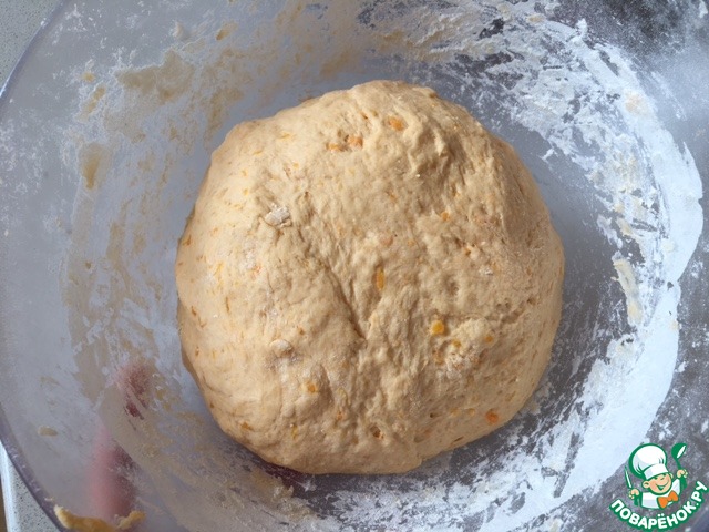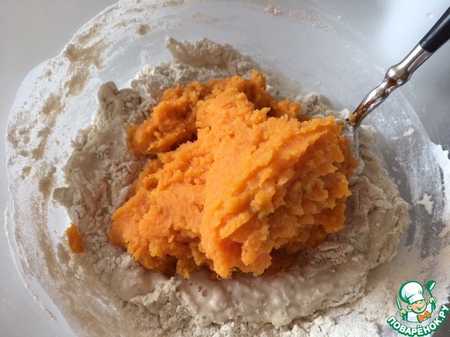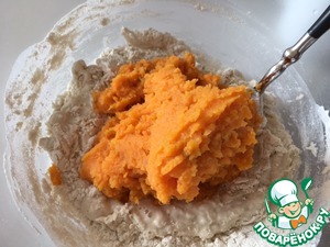 Добавьте муку и 2 ложки кунжутного ароматного масла), соль, замесите тесто. Добавьте сладкий картофель.