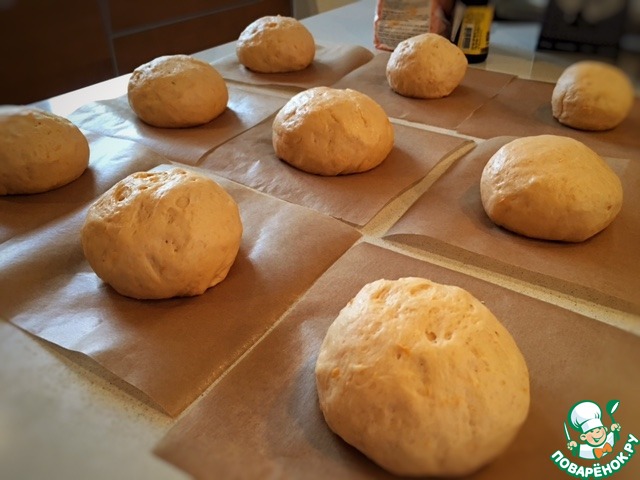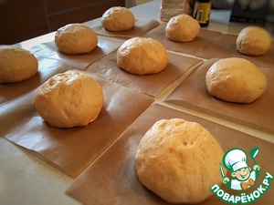 Обомните слегка тесто, скатайте "колбаску", разделите на 10 равных частей. На самом деле, вы можете делать и маленькие булочки и большие. Я пекла как раз большие. Все на ваше усмотрение.