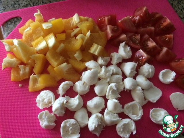 Моцареллу порвать на кусочки, перец и помидоры порезать не мелко.