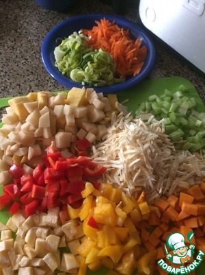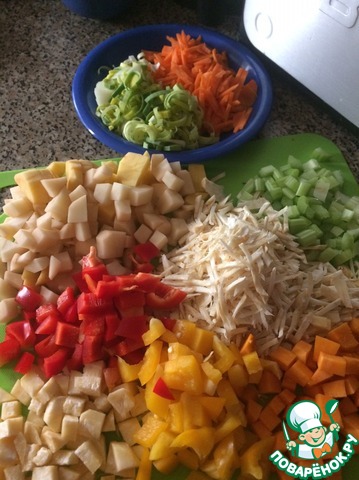 Все овощи измельчаем: сельдерей корневой и морковь натереть на тёрке для корейской моркови, остальное всё нарезать кубиком.