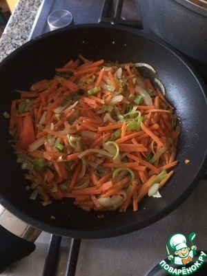 К луку добавить морковь и обжаривать всё вместе до мягкости.