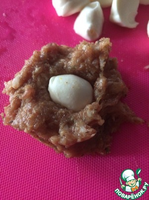 Пока варятся овощи сформировать фрикадельки. В середину лепёшки из фарша положить по кусочку сыра и сформовать шарик.