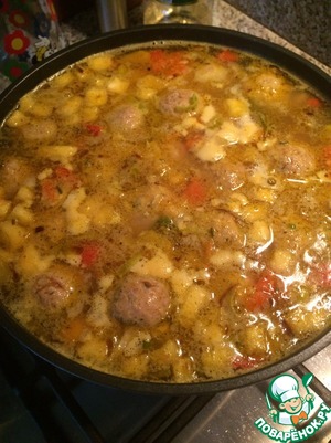 В это время овощи почти готовы. Фрикадельки опустить в суп, минут 8-10 проварить. Добавить приправы, посолить, поперчить.