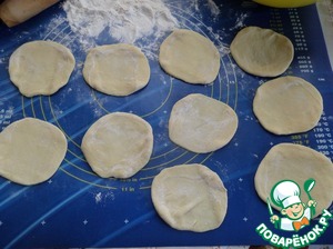Тесто делим на небольшие кусочки. Раскатываем в виде лепешек. У меня получилось 20 шт.