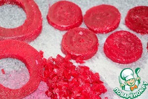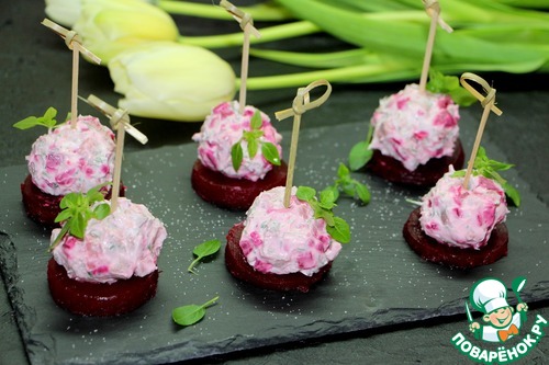 На порционное блюдо выложить свекольные кружочки, слегка присолить.