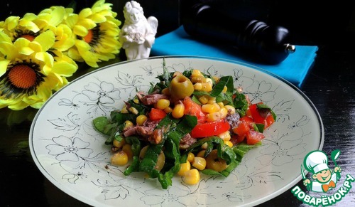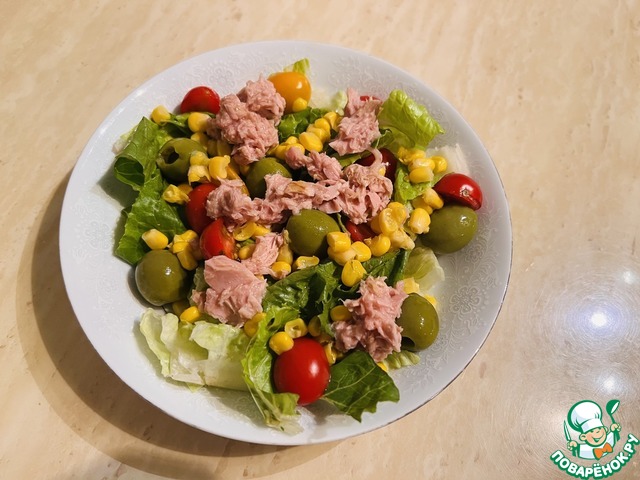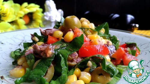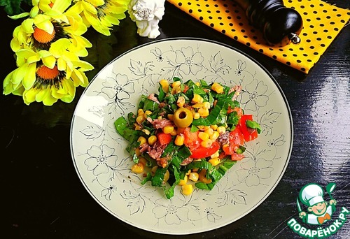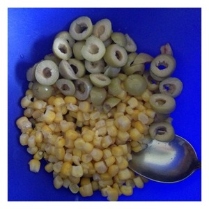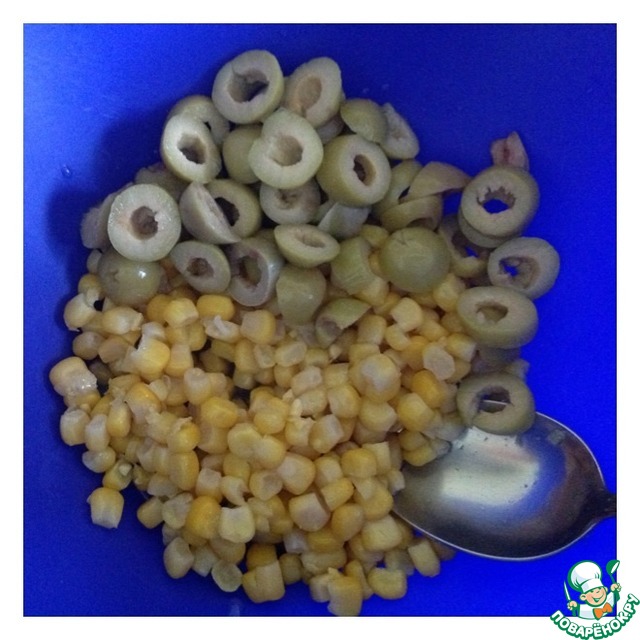 С кукурузы слить лишнюю жидкость. Оливки нарезать кружочками.