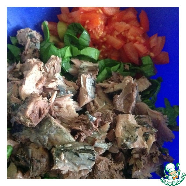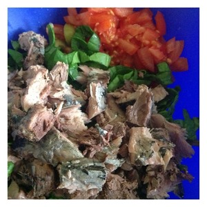 Шпинат нашинковать, помидоры нарезать полуломтиками или кубиками. Как вам удобней. С тунца слить жидкость, вытащить центральную кость. Поломать произвольными кусочками.
