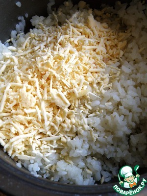 • В холодный рис натереть хорошо плавящийся сыр, отложив немного для верха пирожков.