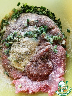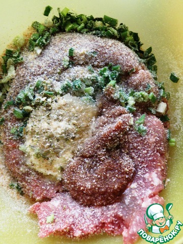 • Фарш (у меня домашний смешанный) выложить в миску, добавить мелко рубленый зеленый лук, сметану, томатный соус, пряности, сахар и соль. Сверху высыпать молотые сухари. Хорошенько вымесить фарш и дать постоять минут 10.