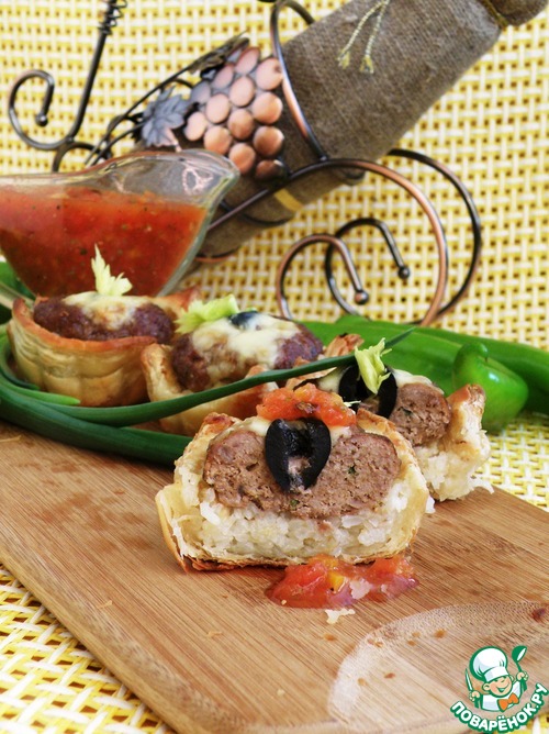 • Разложить тесто по формочкам, прижав в середине и расправив края. Выложить по ложке риса, приминая. Сверху уложить скатанные мокрыми руками тефтельки. В середину вдавить по маслинке.