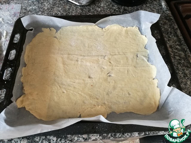 Тесто обмять, и отделить кусочек примерно 150 г. Раскатать его очень тонко в прямоугольник по размеру вашей формы, и поместить на дно формы. Если у вас не получится прямоугольник идеальной формы - ну и не надо, это не главное и его все равно не будет видно.