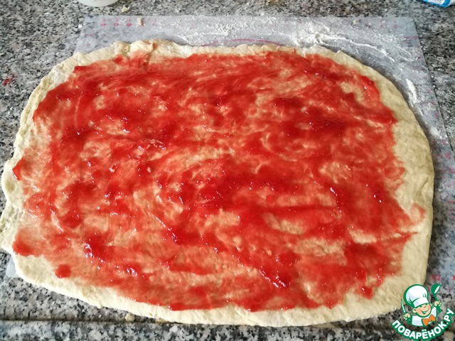 Из оставшегося теста раскатать прямоугольник размером примерно 30 х 40 см и смазать его вареньем, не доходя до края 2 см. Завернуть боковые края по узкой стороне на тесто с вареньем, и затем скатать тесто в рулет.