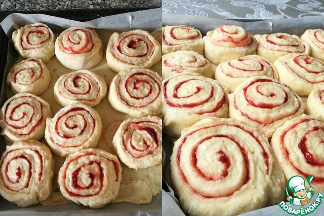Чем шире раскатанный пласт теста для рулета, тем булочки будут выше в высоту. Раскатали этот пласт больше в высоту - булочки будут занимать бОльшую площадь на противне. Но вообще это все маленькие детали.
