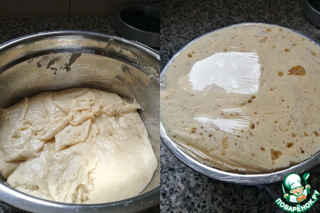 Положить тесто в миску, накрыть пищевой пленкой и поставить в теплое место на 1 час, тесто при этом увеличится примерно в 2-3 раза.
