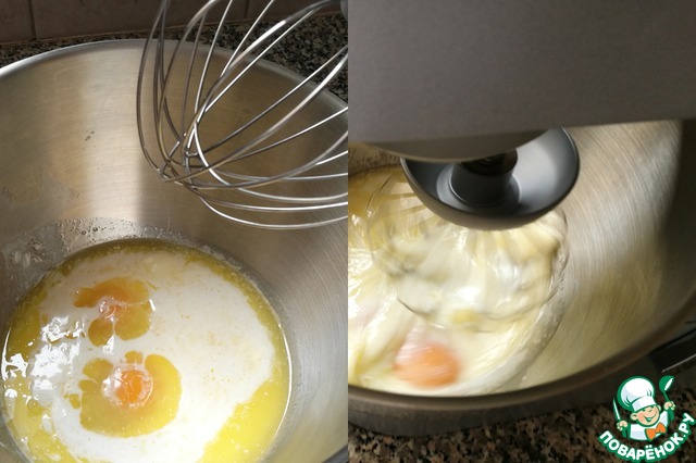 Сливочное масло растопить в микроволновке, соединить с молоком, сахаром, ванильным сахаром и яйцами. Слегка размешать (на самой маленькой скорости примерно пол-минуты).