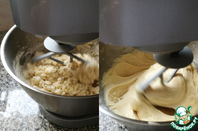 После этого добавить полученное содержимое к яично-молочной смеси в чаше миксера, и вымесить тесто до гладкости. Тесто будет эластичное и мягкое как мочка уха. -