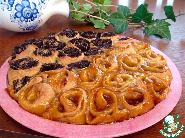 Безусловно, если вы хотите сделать подачу более праздничной, то можете оформить эти булочки в виде круглого пирога. Для теста, приведенного в рецепте, подойдет круглая форма диаметром 26-28 см (больше не надо). Раскатали круг на дно формы, а рулет делать как обычно, прямоугольный, 30 х 40 см.