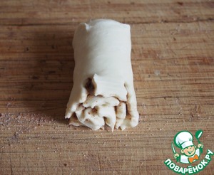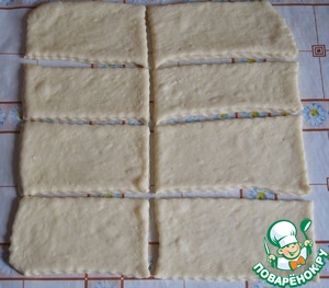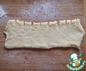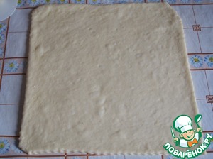 Раскатать тесто толщиной, примерно, 0,5 см в виде прямоугольника.