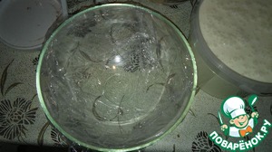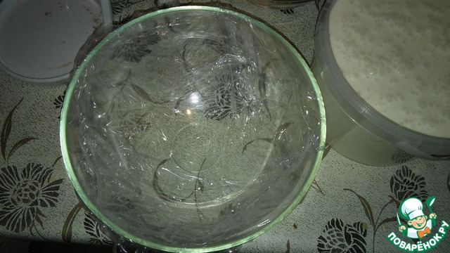 Для сборки торта необходимо выбрать посуду, которая имеет желаемую форму. Подойдет простой салатник. Выстилаем его пищевой плёнкой, оставляя "хвосты", чтобы можно было укрыть торт.