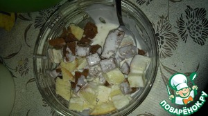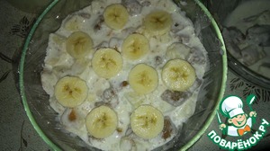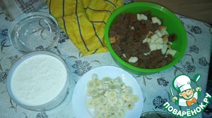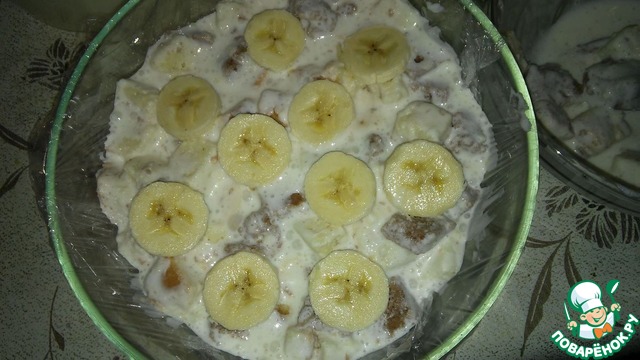 Готовим начинку. По вашему желанию это может быть бананы, нарезаные колечками. Ананасы и грецкие орешки, измельченные в ступе. И пр. -