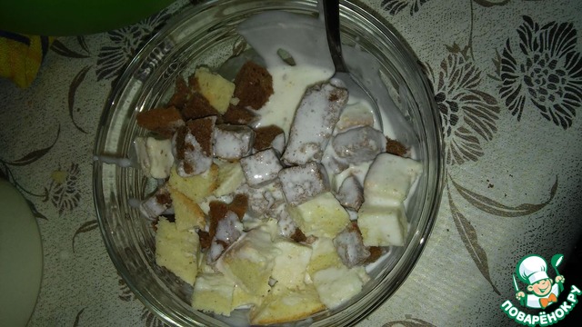 Измельчаем бисквит на кусочки 1,5-2 см.