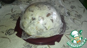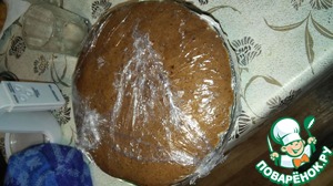 Утром взбиваем остатки сметаны (лучше 20%) с сахаром. Достаём торт из холодильника. Раскрываем плёнку. Накрываем блюдом для подачи торта, переворачиваем эту конструкцию и вынимаем содержимое из "салатника". Освобождаем торт от плёнки. Будьте уверены, торт прекрасно держит форму.