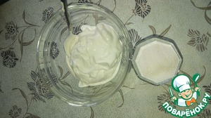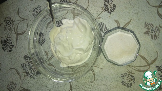 Пока бисквит готовится, взбиваем сметану 15% (700 г) с сахаром (200 г) до растворения сахара.