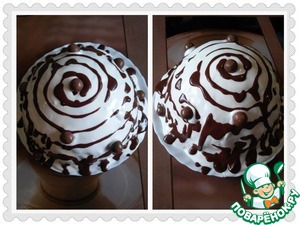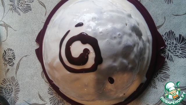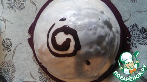 Поливаем торт взбитой сметаной. Убираем торт в холодильник. Топим шоколад на водяной бане, добавляя сливок или молока для нужной консистенции. Вынимаем торт из холодильника, произвольно покрываем растопленым шоколадом.