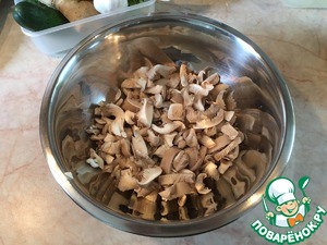 Сложить в одну миску все овощи, грибы, лапшу и содержимое миски с луком, чеснок и имбирем. Тщательно перемешать.