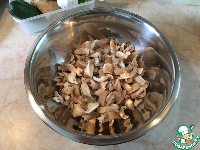 Вешенки вымыть, удалить жесткие части, порезать "соломкой"