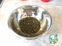 Почистить чеснок и имбирь. Чеснок пропустить через пресс (или натереть на мелкой терке). Имбирь порезать тонкой мелкой соломкой. У лука отрезать белую часть (я ее не выкидываю, а кидаю в контейнер в морозилку - потом использую при варке бульонов), зеленую часть мелко нарезать. Сложить в одну миску.