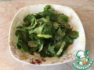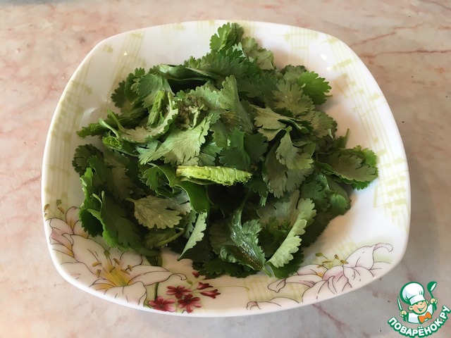 Пучок кинзы промыть. Оборвать листочки (веточки также можно заморозить для бульонов). При желании измельчить.