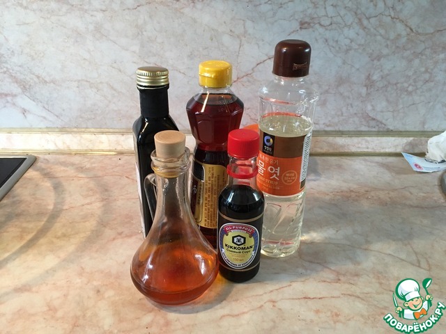 В ту же миску влить соевый соус, бальзамический уксус, кукурузный сироп, кунжутное масло, масло-чили (или мелко порезанный острй перец положить). Попробовать на вкус - скорректировать на свое усмотрение - по соли/сахару/кислоте.