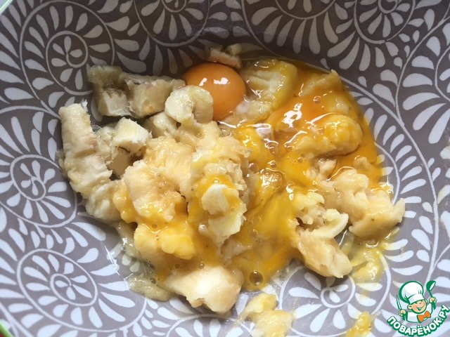 Начнем с самых необычных вафель с черемуховой мукой. Возьмите 2 спелых банана, добавьте яйца и размешайте.
