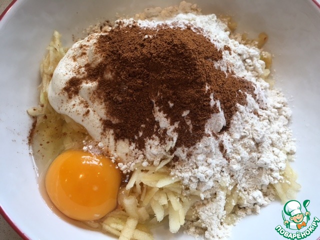 Добавьте муку, разрыхлитель. Всыпьте корицу.