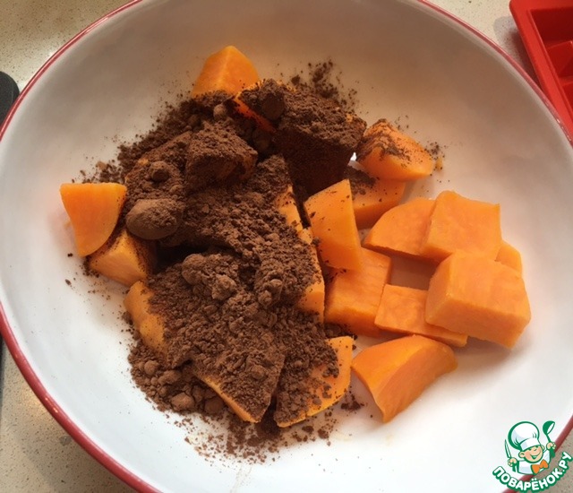 Я заранее отварила батат. Следом нужно добавить 2 ложки какао и смешать все в однородную массу.