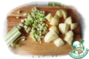 Кастрюлю с бульоном ставим на огонь, доводим бульон до кипения, всыпаем картошку и сельдерей и варим до мягкости.