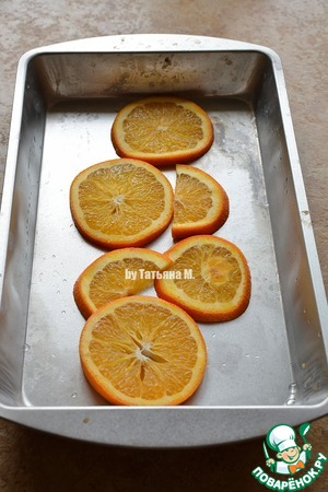 Несколько кружков апельсина выложить в форму для запекания по центру;