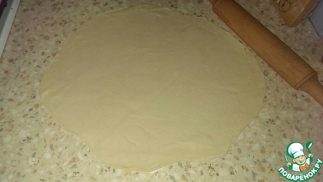 • Тесто, которое уже хорошо подошло, еще раз вымешиваем и делим на две равные части. Раскатываем каждую часть (очень тонко)